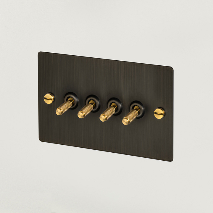 The dimmer knob features our signature, diamond-cut, cross knurl pattern and the flat plate is fixed with our signature, solid metal, coin screws